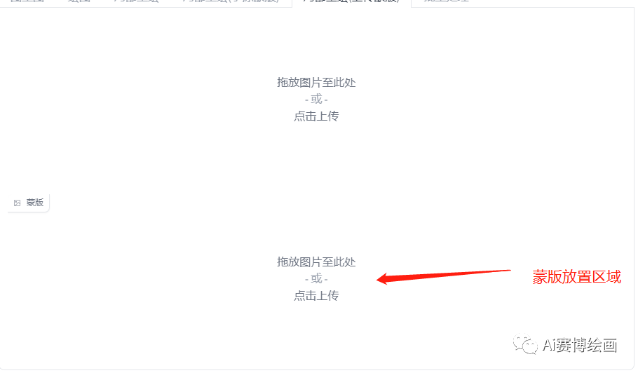 上传蒙版的界面和局部重绘的界面是一样,功能上也是完全一致的,但是 唯一不同的是多了一个蒙版上传区域