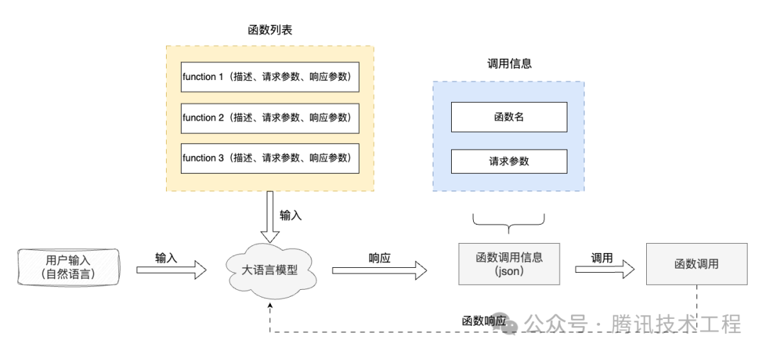 调用方获得 LLM 返回的函数调用信息(函数名称和调用参数)后,自行调用函数,并得到函数执行的响应。如果有需要,还可以把函数执行的响应追加到 chat API 的对话中传给 LLM,让 LLM 组织成自然语言回复用户。