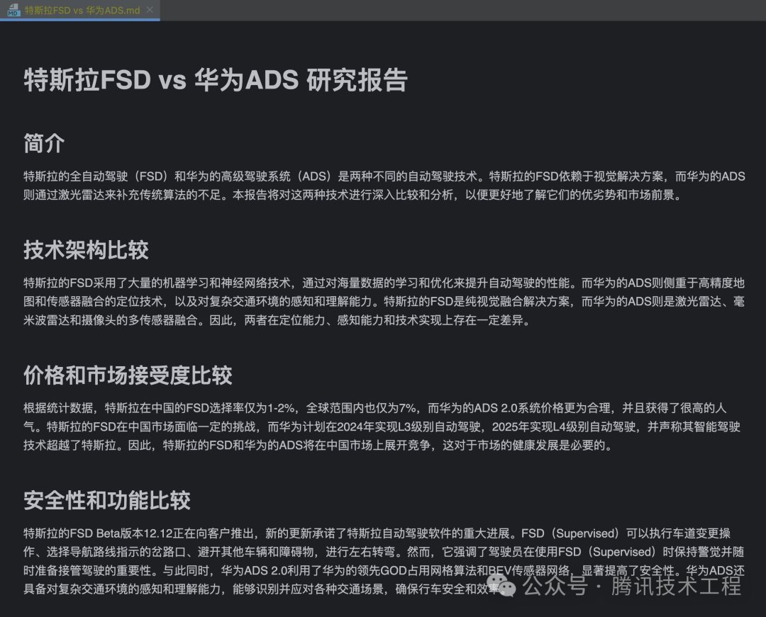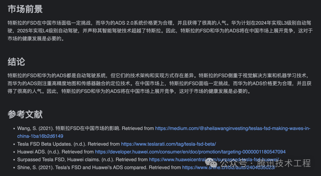 推理1:当前知识不足以回答这个问题,要回答该问题,需要知道什么是「特斯拉FSD 」和「华为ADS」 行动1:使用搜索工具搜索「特斯拉FSD 」和「华为ADS」的资料 观察1:总结行动1的内容 推理2:基于行动1和观察1的信息,得知这是关于两个自动驾驶提供商的方案对比,基于已有的信息,现在需要生成报告 行动2:使用生成报告的工具,生成调研报告 观察2:任务完成