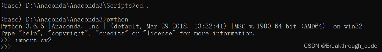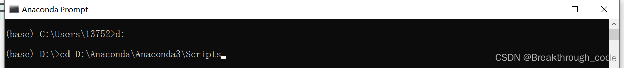 打开prompt,先跳转到你anaconda所在的盘(记得先跳转到你anaconda文件所在盘,我是教训,哈哈),我是d盘。接着用cd 命令进入Scripts文件夹