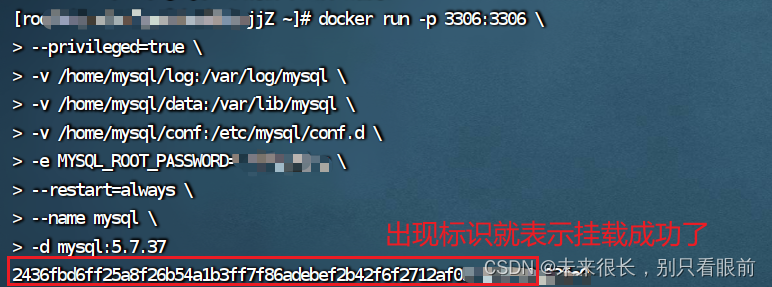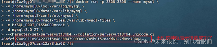 4、启动MySQL容器,这里自己指定自己的密码,我们就指定为 root就行。