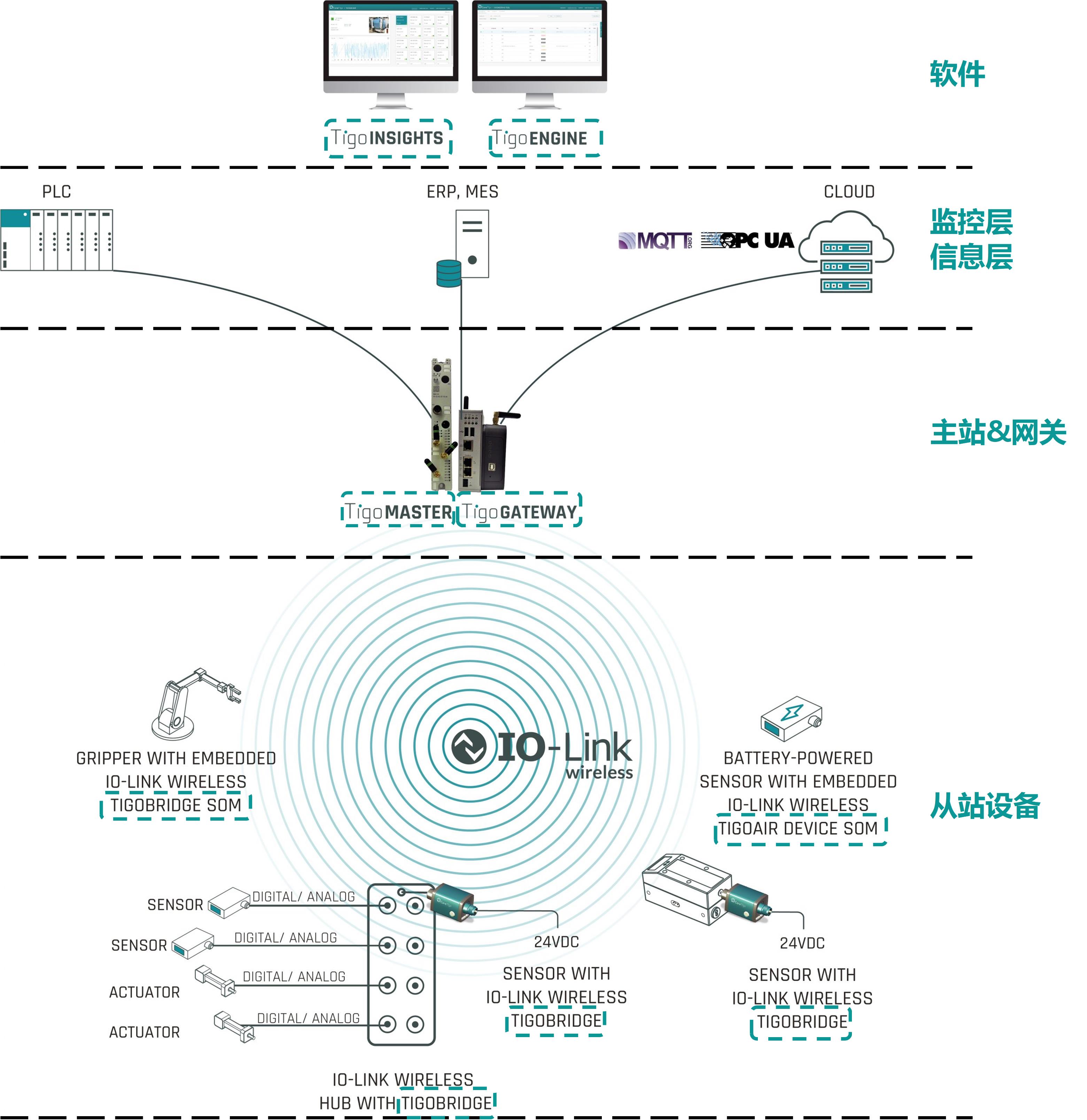 1、IO-Link无线从站设备。对于从站设备,有两种解决方案,一是TIGOBRIDGE桥接器, 对有线IO-Link传感器/执行器进行连接,就可将其转换成IO-Link无线设备。二是TIGOBRIDGE SOM、TIGOAIR SOM、TIGOAIR LP三种嵌入式模块,用于开发各类IO-Link无线传感器、执行器或I/O集线器。