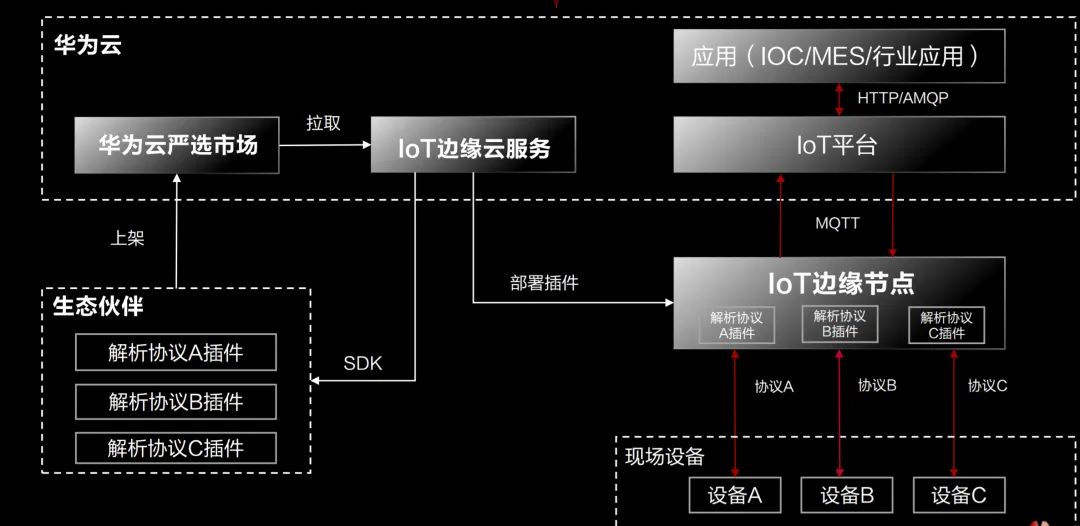 协议插件生态拓展框架生态伙伴基于IoT边缘服务提供的SDK开发协议插件,可以独立上架到华为云严选市场,客户购买后IoT边缘服务拉取插件部署到边缘节点,现场设备按协议接入边缘节点,解析后转换成标准数据上下行。