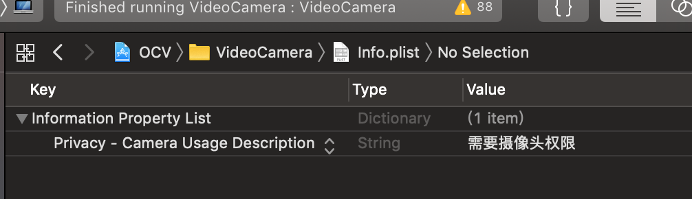 然后在plist文件中添加摄像头限制;NSCameraUsageDescription