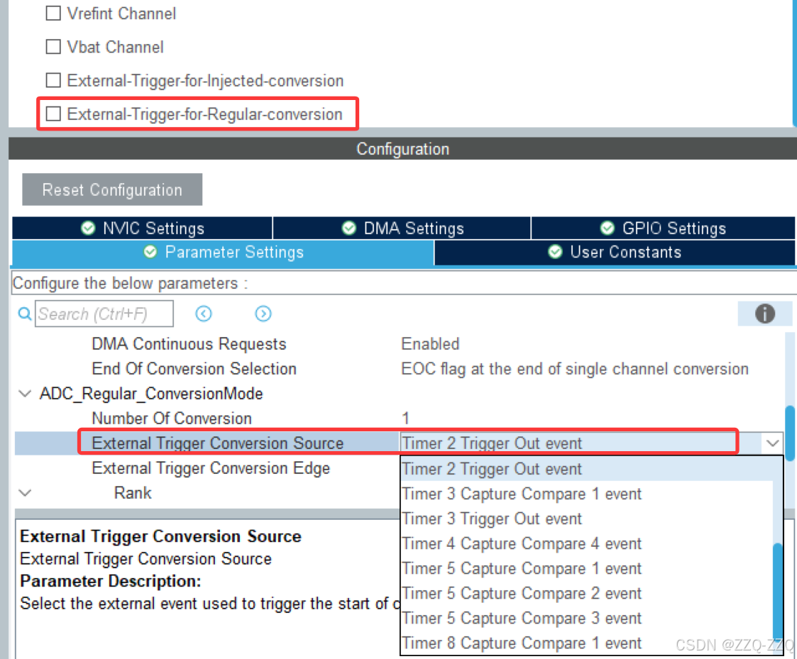 在CubeMX的ADC配置中,在Mode里有一个选项是EXTI Conversion Trigger,可选Regular Trigger。在Configuration里的ADC_Regular_ConversionMode中也有一个选项是External Trigger Conversion Source,可选项是Regular Conversion launchcd by software、Timer 3 Trigger Out event等,我想知道EXTI Conversion Trigger和External Trigger Conversion Source的作用分别是什么?有什么区别,尤其是EXTI Conversion Trigger的Regular Trigger和External Trigger Conversion Source的Timer 3 Trigger Out event我感觉作用很像?
