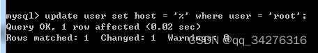 (3)执行update user set host = ‘%’ where user ='root’将Host设置为通配符%。Host设置了“%”后便可以允许远程访问。