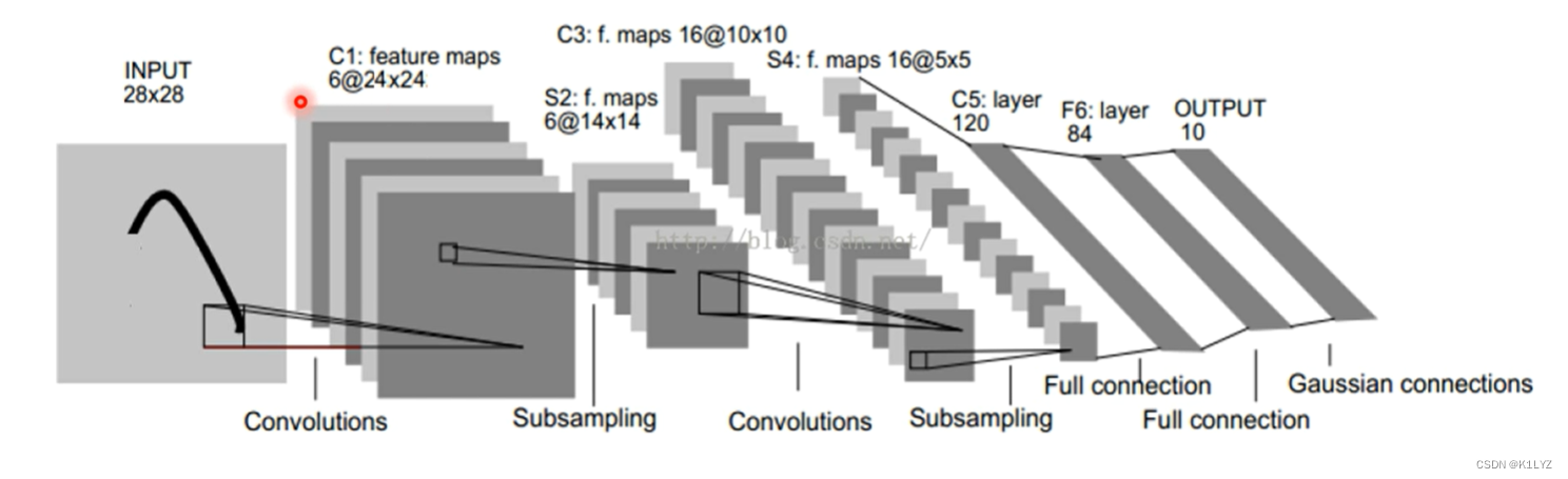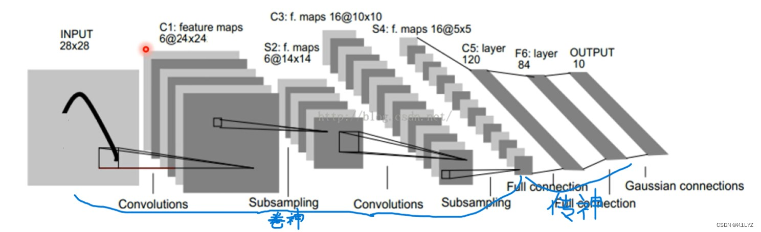 以上图为例,在S4这一步一共有16个5*5分辨率的二维/特征图像,将他们拉伸成一维特征向量(一个个像素点依次排列,一共400个像素点,长度为400),然后作为输入层的输入数据传输到隐藏层,图中有两个隐藏层,分别含有120个神经元和84个神经元,最后输出10个类别的概率。