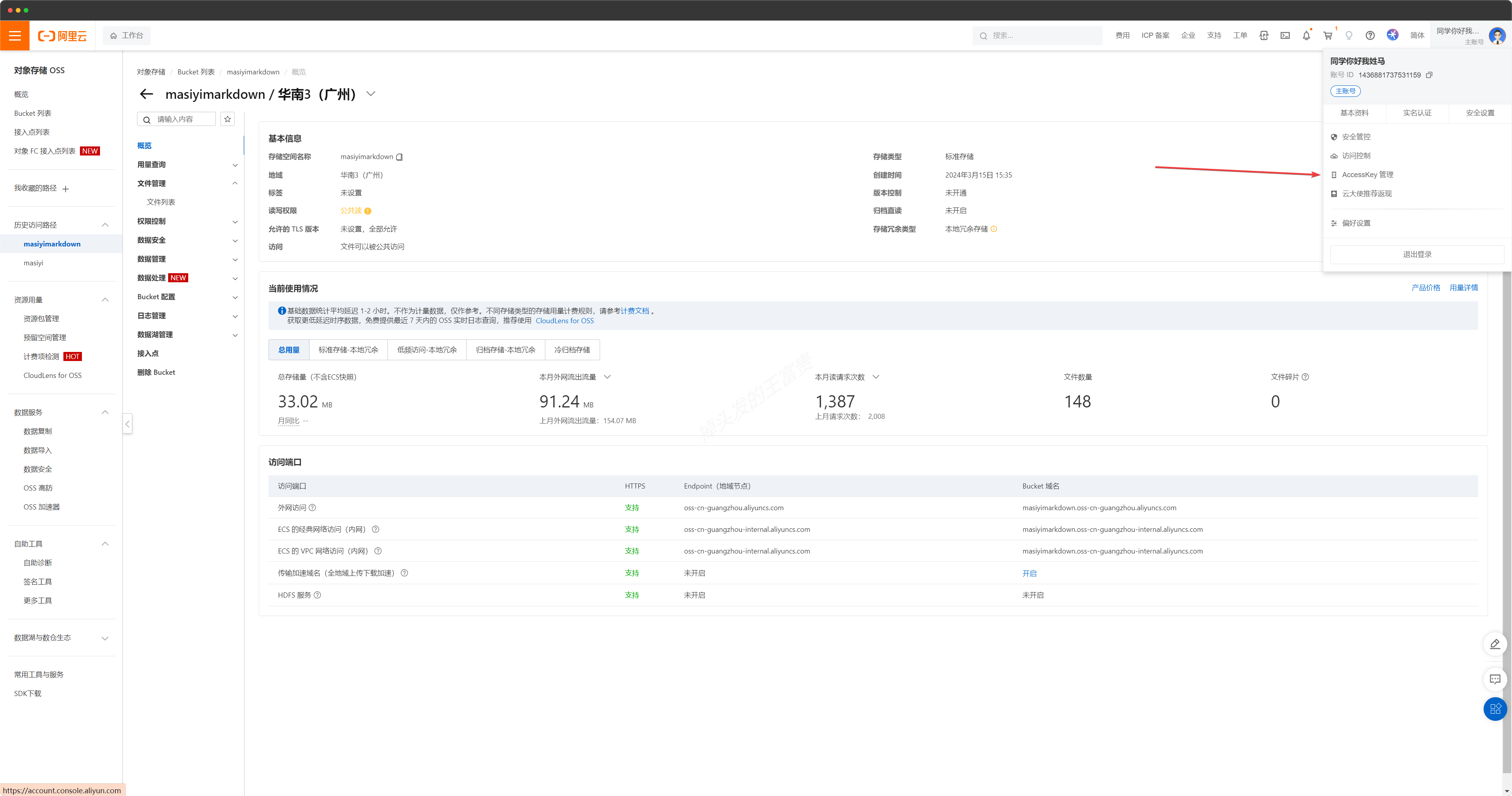 Endpoint(地域节点)根据你创建的bucket的所在地址来决定endpoint是什么,例如我上面的地域是广州则是:https://oss-cn-guangzhou.aliyuncs.com