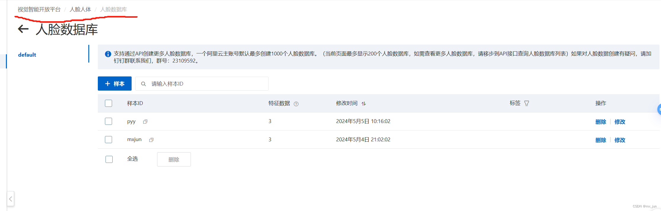 进入上面工作台后,我们再进入如下位置先配置我们的人脸图像库(default)