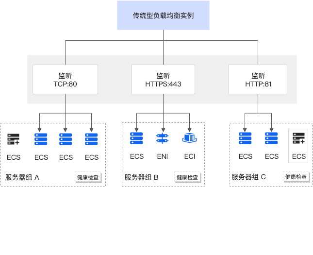 传统型负载均衡CLB(Classic Load Balancer)是将访问流量根据转发策略分发到后端多台云服务器的流量分发控制服务。CLB扩展了应用的服务能力,增强了应用的可用性。