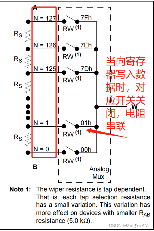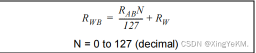 MCP4017的默认总阻值为100kΩ ,对应0-127个档位,当寄存器为0时,阻值为0;