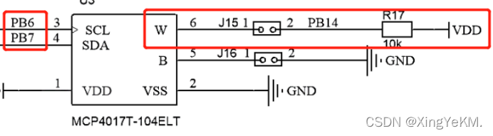 查阅产品手册可知,MCP4017使用I2C通讯协议,引脚为PB6,PB7 ,控制的电阻连接至PB14,同时跳线帽连接J15.1与J15.2