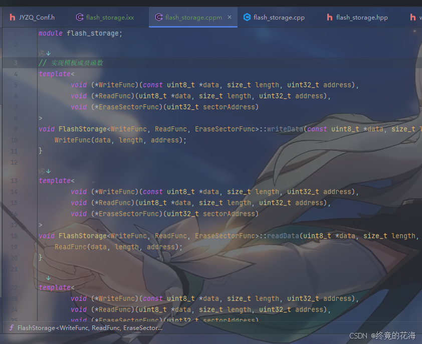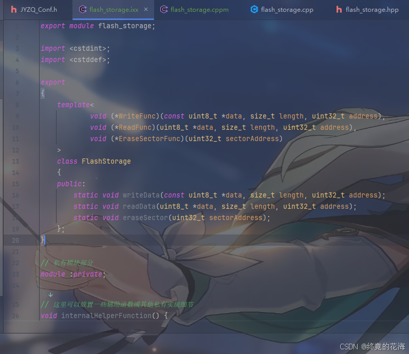 // flash_storage.ixx export module flash_storage; import <cstdint>; import <cstddef>; export { template< void (*WriteFunc)(const uint8_t *data, size_t length, uint32_t address), void (*ReadFunc)(uint8_t *data, size_t length, uint32_t address), void (*EraseSectorFunc)(uint32_t sectorAddress) > class FlashStorage { public: static void writeData(const uint8_t *data, size_t length, uint32_t address); static void readData(uint8_t *data, size_t length, uint32_t address); static void eraseSector(uint32_t sectorAddress); }; } // 私有模块部分 module :private; // 这里可以放置一些辅助函数或其他私有实现细节 void internalHelperFunction() { // ... }