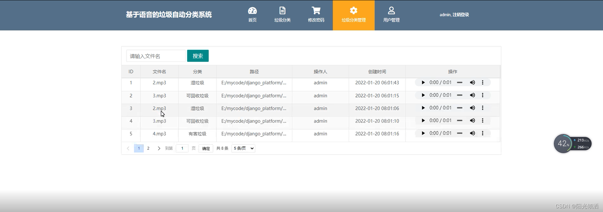 本文主要讲述了是使用Python技术与MySql数据库实现的基于语音识别的智能垃圾分类系统平台的详细过程。这里所谓的智能垃圾分类系统是建立一个类似对用户输入的语音进行识别和垃圾分类的系统,用户将自己的需求录入成音频文件然后上传进行识别,从个人用户的角度来看,有了这个更方便的工具,可以很好的进行垃圾分类和处理。从利于社会发展的角度来说,可以提高垃圾分类的效率,真正贯彻国家对垃圾分类重视的政策。