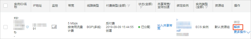 - 在弹性公网IP页面,找到与源实例解绑后的弹性公网IP。