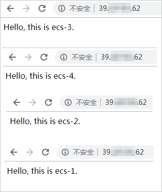 为方便测试,本教程分别在四台ECS实例上搭建了静态网页,以标识每台ECS实例。在浏览器中输入负载均衡实例的服务地址,测试负载均衡服务。由于调度算法为轮询,请求会轮流发往每台ECS实例。