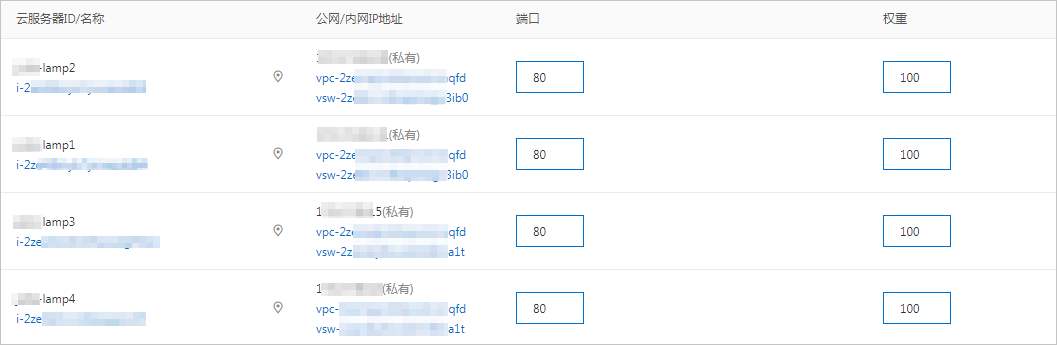 - 勾选源实例和已复制的三台ECS实例,单击下一步:配置权重和端口号。端口配置为80,其他值保持默认,单击下一步。