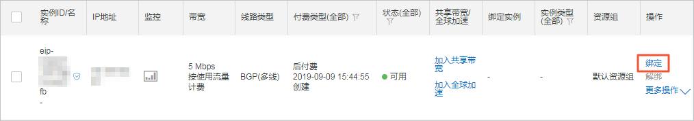 - 在操作列,单击绑定。