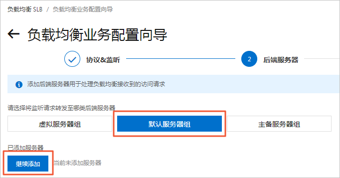 - 单击下一步。在后端服务器页签,选择默认服务器组,单击继续添加添加ECS实例。