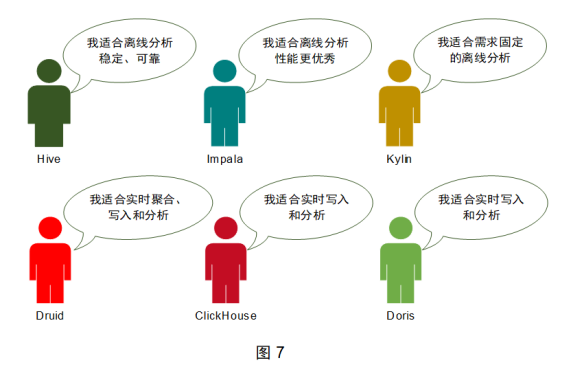 数据分析技术框架包括Hive、Impala、Kylin、Clickhouse、Druid、Drois等,它们的典型应用场景如图7所示。