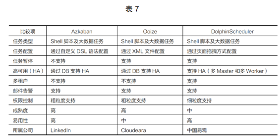 包括Azkaban、Ooize、DolphinScheduler等。它们适用于普通定时执行的例行化任务,以及包含复杂依赖关系的多级任务进行调度,支持分布式,保证调度系统的性能和稳定性,它们之间的区别见表7。
