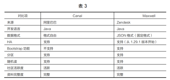 Cannal和Maxwell常用于关系型数据库实时数据采集,它们之间的细节区别见表3: