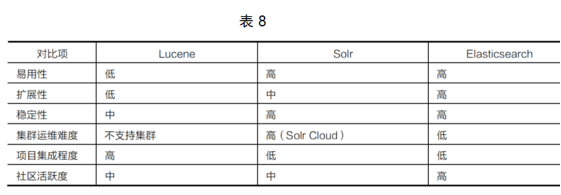 在选择全文检索引擎工具时,可以从易用性、扩展性、稳定性、集群运维难度、项目集成程度、社区活跃度这几个方面进行对比。Lucene、Solr和Elasticsearch的对比见表8。