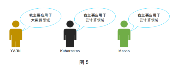 在大数据时代到来之前,服务器资源的变更对应的是系统的上线和下线,这些变动是有限的。随着大数据时代的到来,临时任务的需求量大增,这些任务往往需要大量的服务器资源。如果此时还依赖运维人员人工对接服务器资源的变更,显然是不现实的。因此,分布式资源管理系统应运而生,常见的包括YARN、Kubernetes和Mesos,它们的典型应用领域如图5所示。