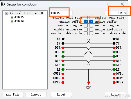 为了方便自行测试串口助手,于是使用了com0com开了虚拟串口,这个功能如果想要正常使用,需要设置两个名称,选择两个没有被使用的串口就性,然后使能缓冲区,最后点击右下角的Apply
