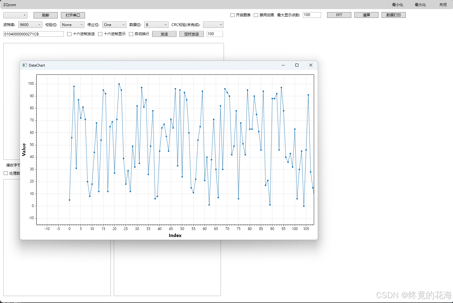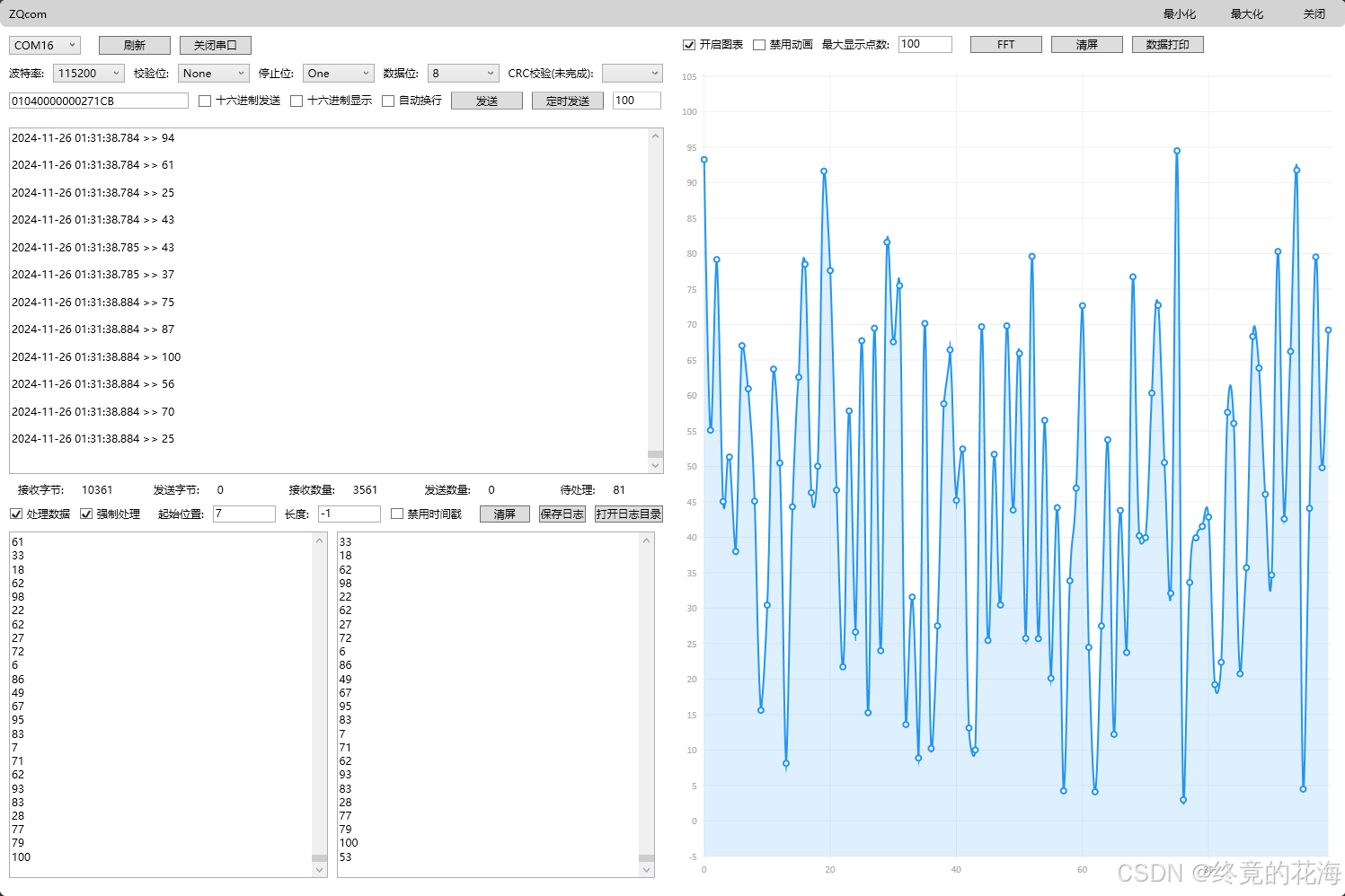 所以发送大量数据后,你会看到日志框已经停下来了,但图表框和数据处理框可能还在工作。