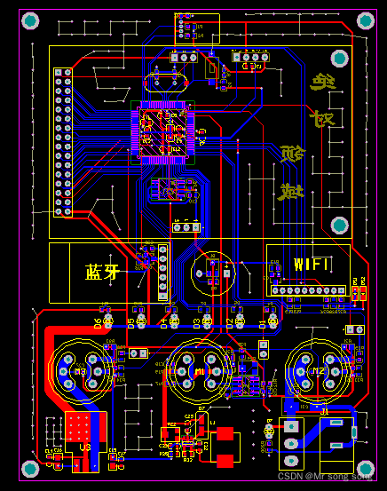 主控芯片用的是100脚的STM32F103VET6,陀螺仪用的是MPU6050,电机驱动用的是TB6612,蓝牙是汇承的HC05邮票孔封装的,WIFI用的是济南有人科技的USR-WIFI232-S,小车底盘用的是平衡小车之家的某一款带编码器的(不是我买的,同学的),电池用的是一节7.2的镍镉电池,液晶用的是中景园电子1.3寸IIC接口的OLED,开关用的是三脚纽子开关,电池接口用的是T插,电阻电容这些用的基本上是0603封装,编码器5V降压用的是ASM1117-5.0,3.3V降压用的是SP6203,拨码开关用的是4P贴片式2.54mm角距的,按键是两脚贴片,microusb接口用的是5针 7.2四脚插板牛角母座,超声波是某宝上几块钱烂大街的那种,蜂鸣器是有源的,编码器是小车底盘自带的,电池电压检测是电阻分压之后通过电压跟随器接入MCU内部AD测量的。