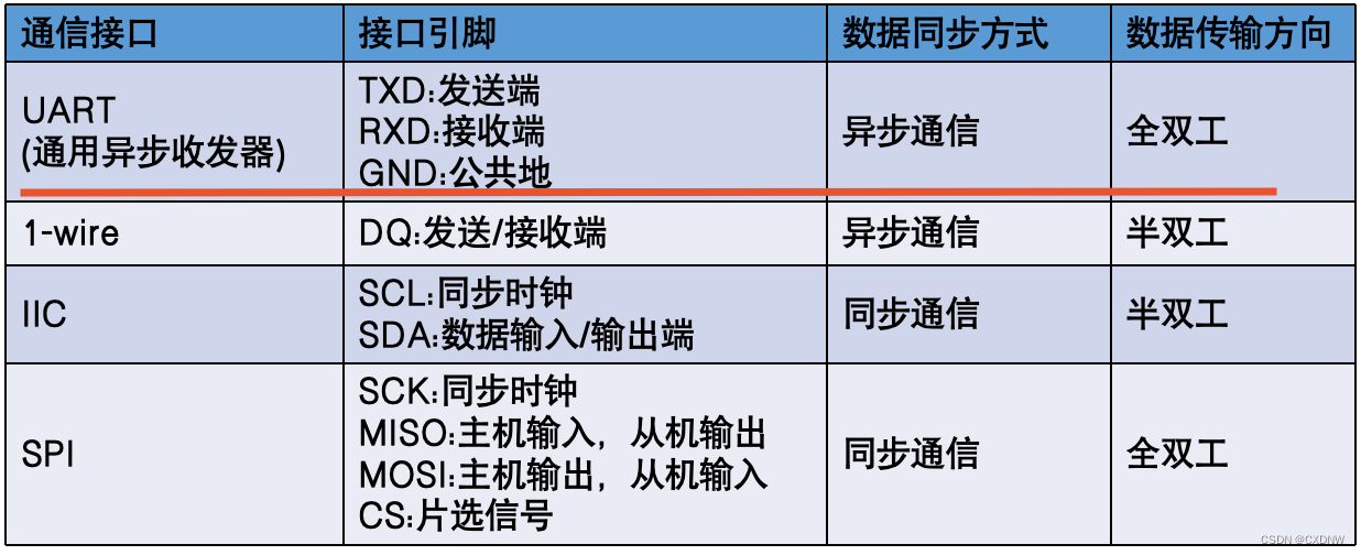 (2)异步通信:没有时钟信号,通过在数据信号中加入起始位和停止位等一些同步信号。