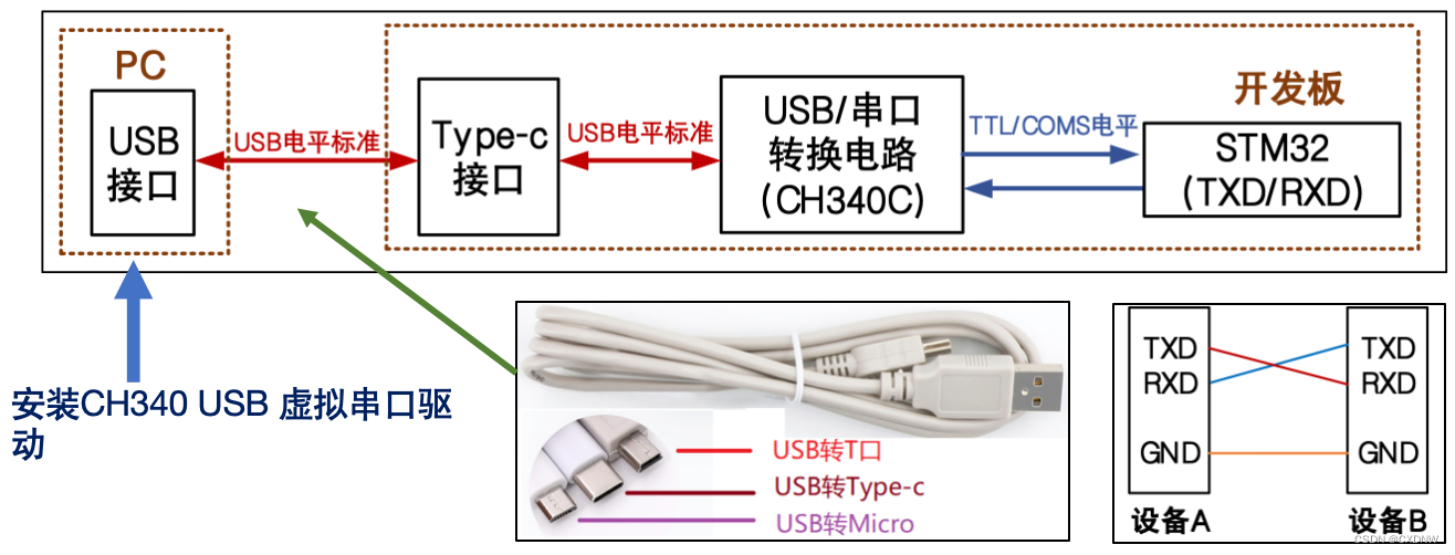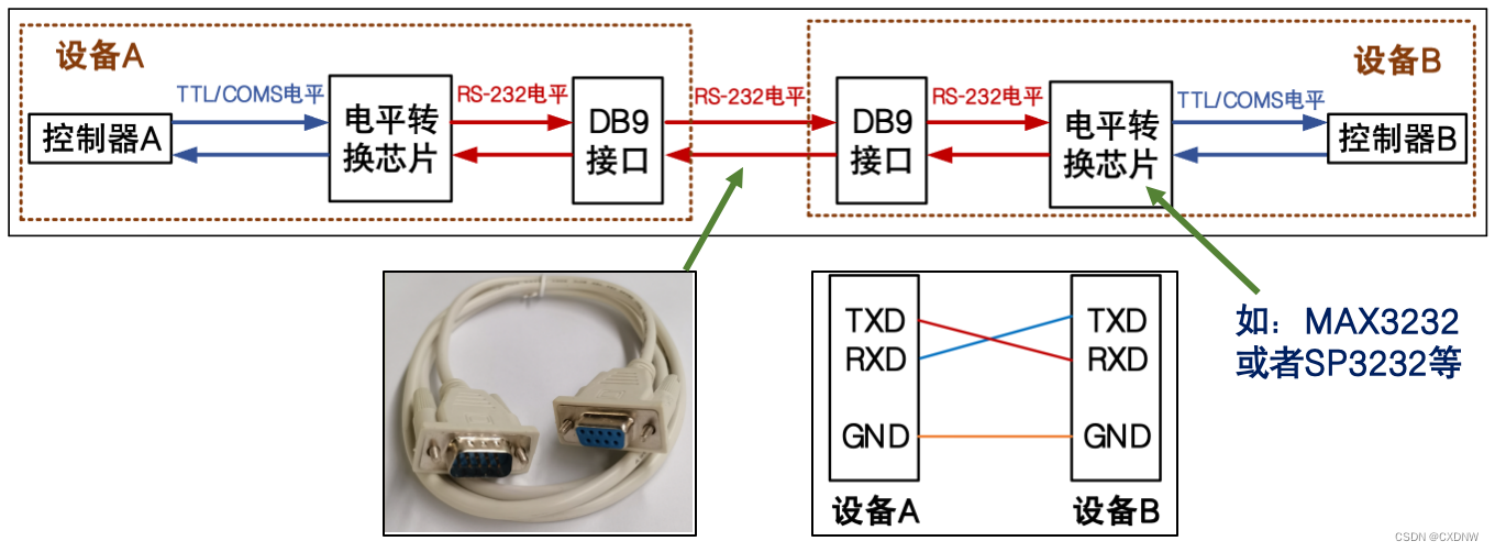 注意:两个设备之间的TXD和RXD,必须交差连接,方可正常通信。