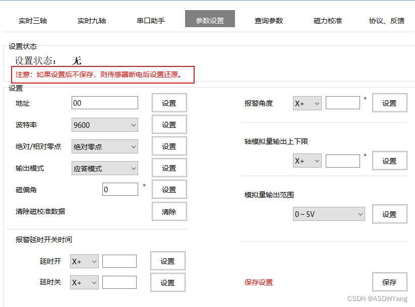 如上所示相应的软件,软件中存在一句如果设置后不保存,则存在传感器断电后设置还原。在实际设计接口的时候,发现这款软件即便是设置后进行了保存,如果连续开关断电时间过长,还是会存在断电还原的情况,因此,在测试代码之中需要写出对于初始状态的判断。
