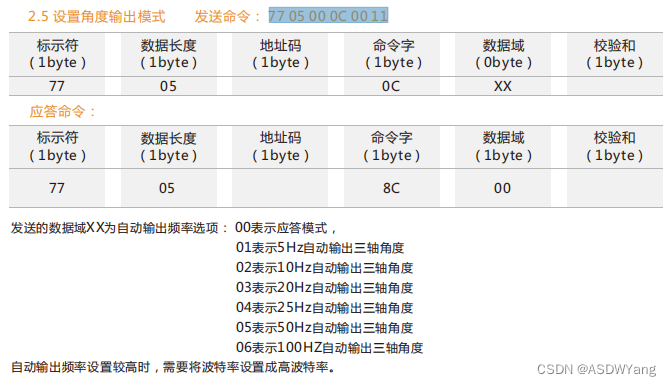 // 设置角度输出频率模式 77 05 00 0C 06(100Hz 05 50Hz 04 25Hz) 11 100Hz