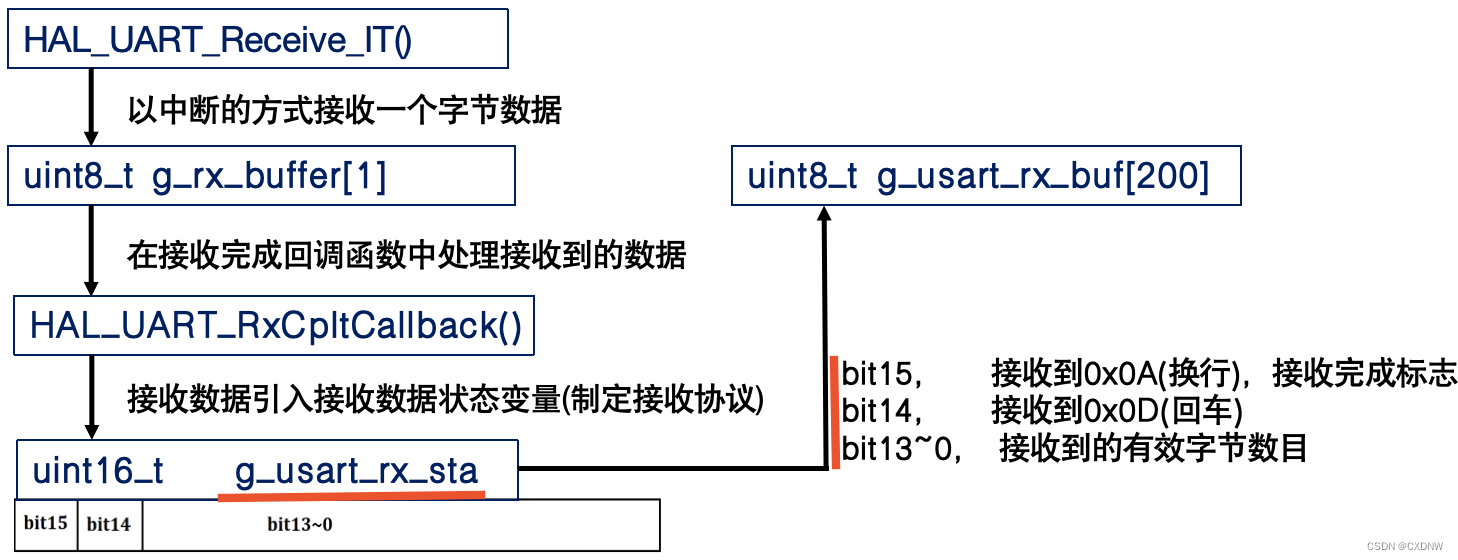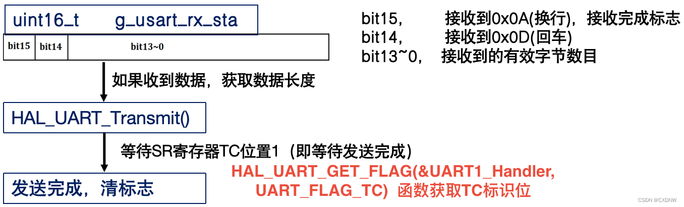 ③接收协议设计:【 定义数组g_usart_rx_buf[]、接收状态寄存器g_usart_rx_sta(自行添加)实现对串口数据的收发管理 】当接收到从电脑发过来的数据,把接收到的数据保存在 g_usart_rx_buf[] 中,同时在接收状态寄存器(g_usart_rx_sta) 中计数接收到的有效数据个数,当收到回车(由2个字节组成:0X0D 和0X0A)的第一个字节0XOD时,计数器将不再增加,等待0X0A的到来,而如果 0X0A 没有来到,则认为这次接收失败,重新开始下一次接收。如果顺利接收到 OX0A,则标记 g_usart_rx_sta 的第15 位,这样完成一次接收,并等待该位被其他程序清除,从而开始下一次的接收,而如果迟迟没有收到OX0D,那么在接收数据超过g_usart_rx_buf长度的时候,则会丢弃前面的数据,重新接收。