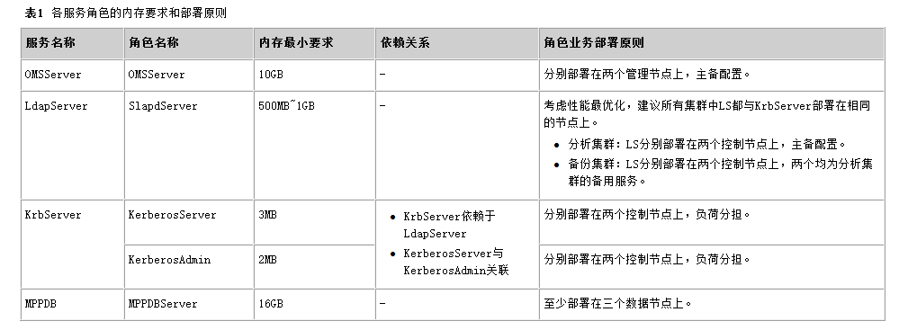 FusionInsight LibrA集群由多种服务按照一定的逻辑架构组合而成,每个服务包含一个或多个角色,每个角色可以部署一个或多个实例。安装集群时,选择不同的服务角色部署到各服务器中。通常在《配置规划工具》中填写各节点的服务角色信息,并生成相应的配置文件,用于安装集群时使用。各服务角色的内存要求和部署原则如所示。