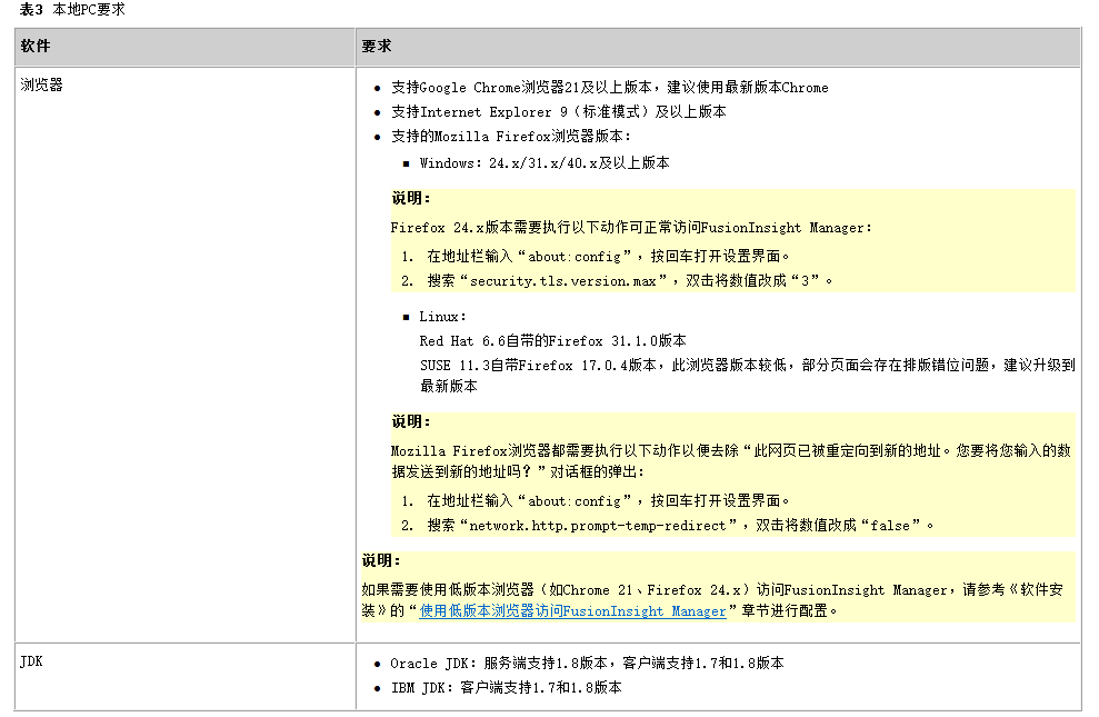 为保证FusionInsight LibrA集群能够顺利安装,本地PC要求如表3所示。