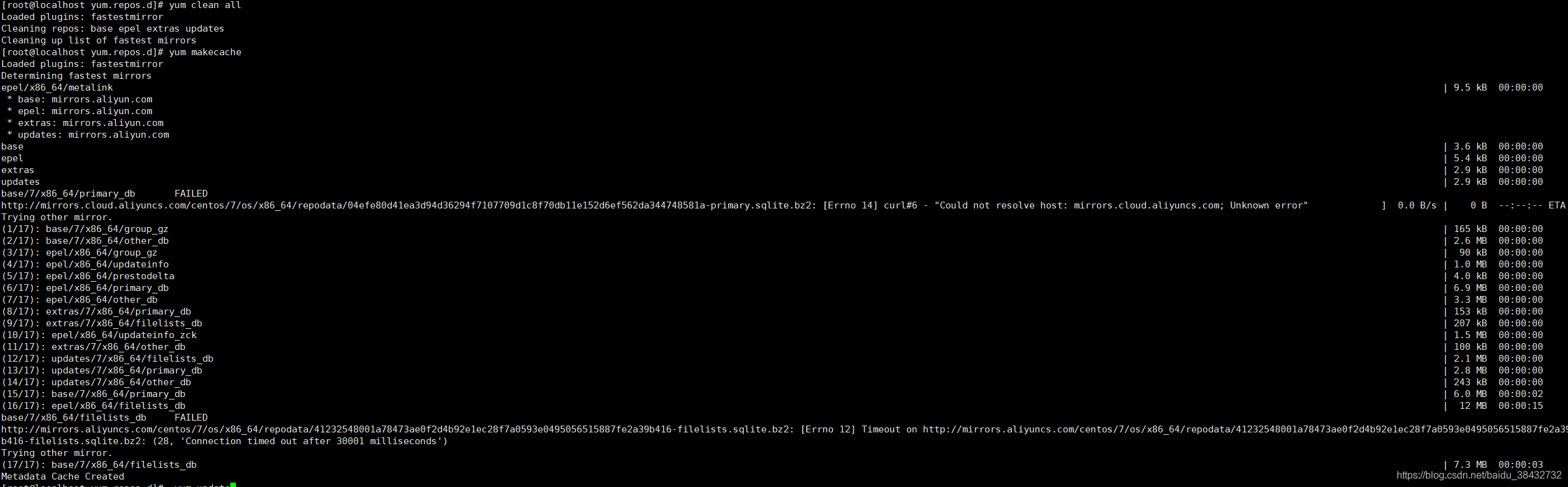 1、备份原有的yum配置[root@localhost ~]# cd /etc/yum.repos.d/[root@localhost yum.repos.d]# lltotal 40-rw-r--r--. 1 root root 1664 Nov 23 2018 CentOS-Base.repo-rw-r--r--. 1 root root 1309 Nov 23 2018 C...