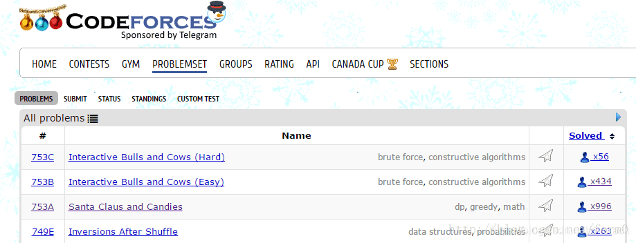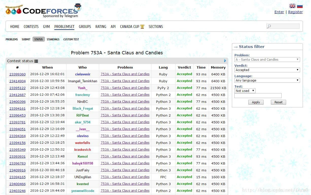 Codeforces上如何查看别人的代码 题解摘自https://blog.csdn.net/form0/article/details/53944191第一步:点击题目右边的人数第二步:点击最左边的数字即可查看提醒,比赛第二天,数字链接点进去,是看不到代码的,稍安务躁。2019-12-15...