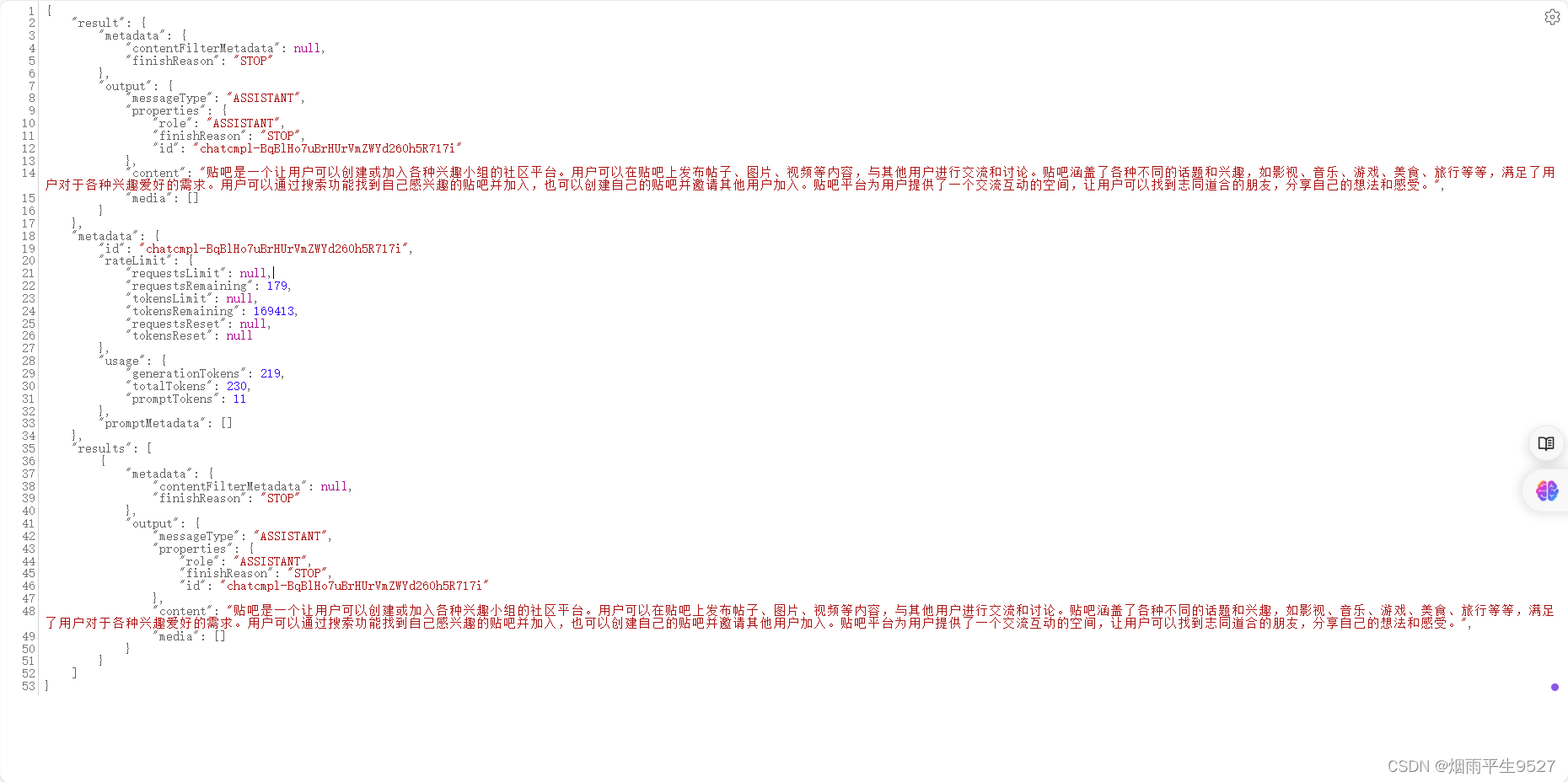 return chatResponse.getResult().getOutput().getContent(); // 从chatResponse对象中获取结果,然后获取输出内容,并将其作为返回值返回