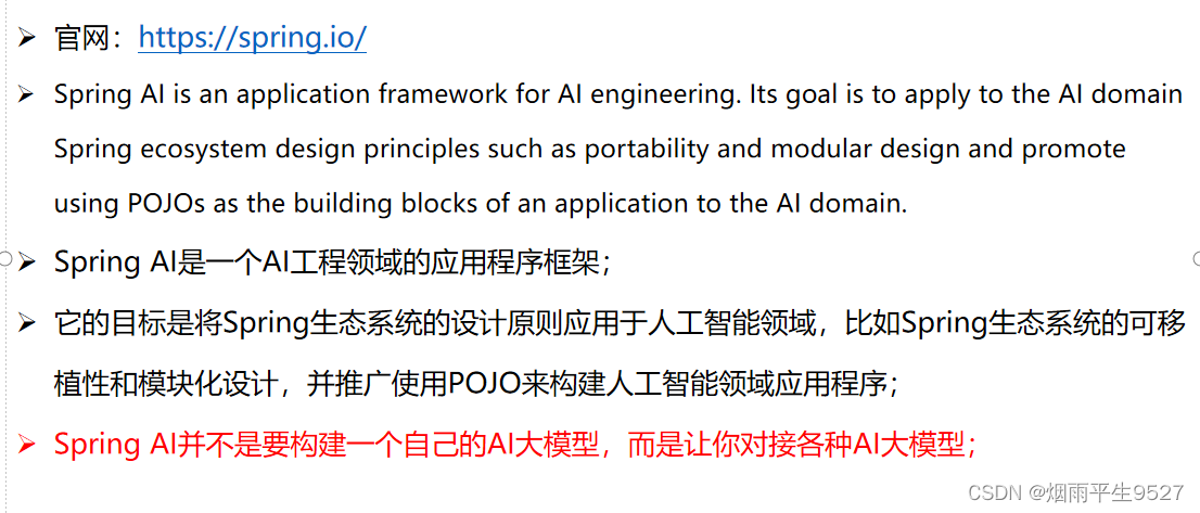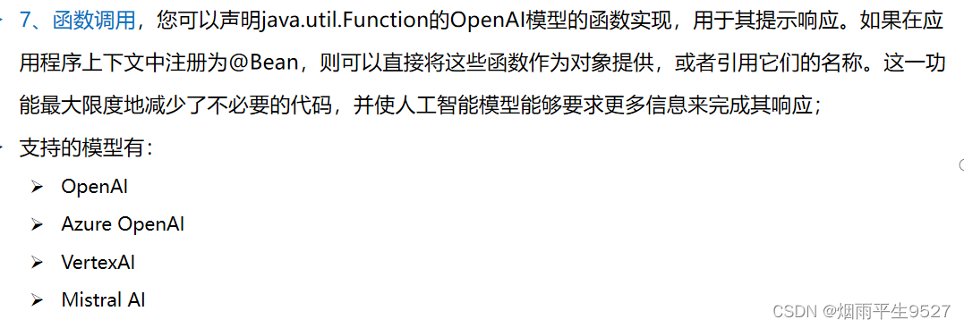 Spring AI提供的API支持跨人工智能提供商的 聊天,文本到图像,和嵌入模型等,同时支持同步和流API选项;