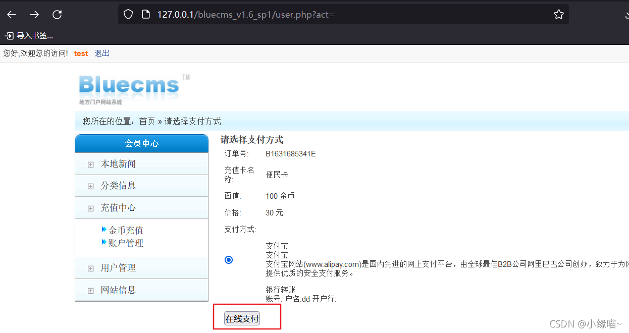 先去到漏洞链接所在处,会员中心->充值中心->金币充值->在线支付。