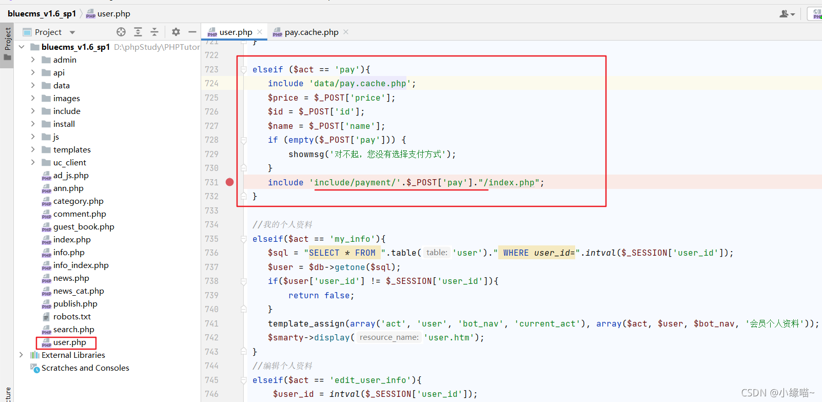 目录BlueCmsPOC构造漏洞利用BlueCmsBlueCMS是一款专注于地方门户网站建设解决方案,基于PHP+MySQL的技术开发,全部源码开放。复现版本为bluecmsv1.6版本,各位可自行下载。POC构造可以先用代码审计工具如Seay扫一波,或者直接观察代码。如下在user.php中,可以看到,如果act参数为pay值,这包含 'include/payment/'.$_POST['pay