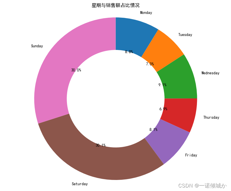 (4) 绘制圆环图分析星期与销售额占比情况。