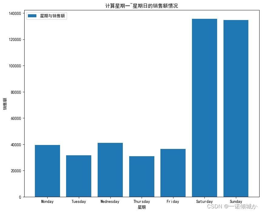 (3) 计算星期一~星期日的销售额并绘制柱状图分析星期与销售额的情况。