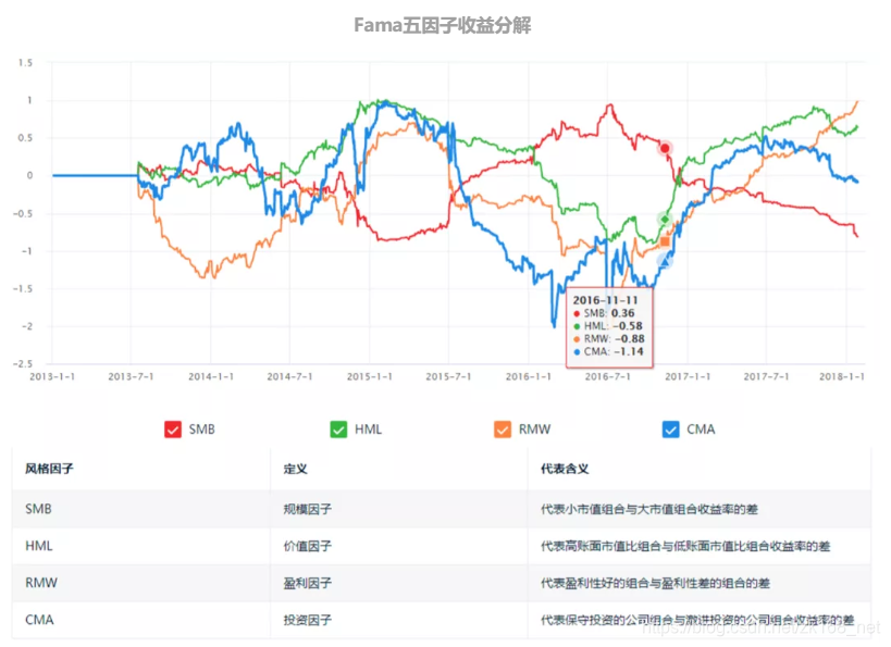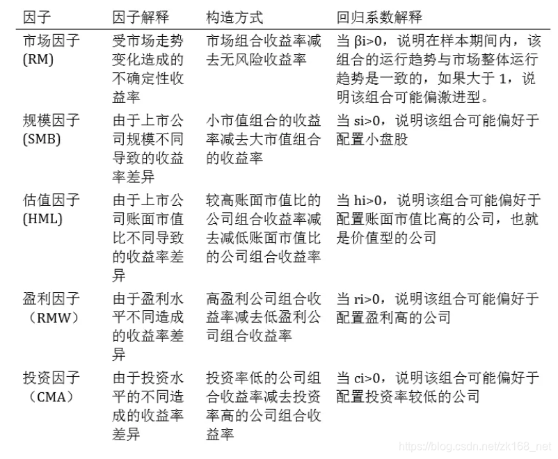 Fama-French 五因子模型将超额收益分为 5 个因子来解释,具体如下表