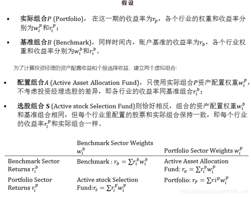 引言即使风格相似、收益表现相似的组合,其收益来源也可能不尽相同,通过业绩归因,能够更加清楚组合的收益究竟来源于什么,进而知道这种获取超额收益的能力是否能够持续,也能够明白组合发生剧烈波动的原因,从而改进策略。下面将介绍两种常用的业绩归因方法。1、Brinson收益分解Brinson 模型是最常用的绩效分解模型,由Brinson 和Fachler 在论文《Measuring Non−US Equit