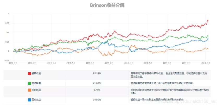 例如:将现金和风险资产看作两个行业,对这两个行业使用上述的 Brinson 分析法,可以得到操作过程中择时(行业配置)贡献的收益以及对风险资产的操作提供的收益分别是多少。