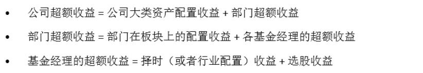 将 Brinson 模型应用于各种不同的层面,比如公司层面、部门层面、基金经理层面,我们可以得到不同层次的分解结果。最后可以自上而下分解出公司超额收益的来源